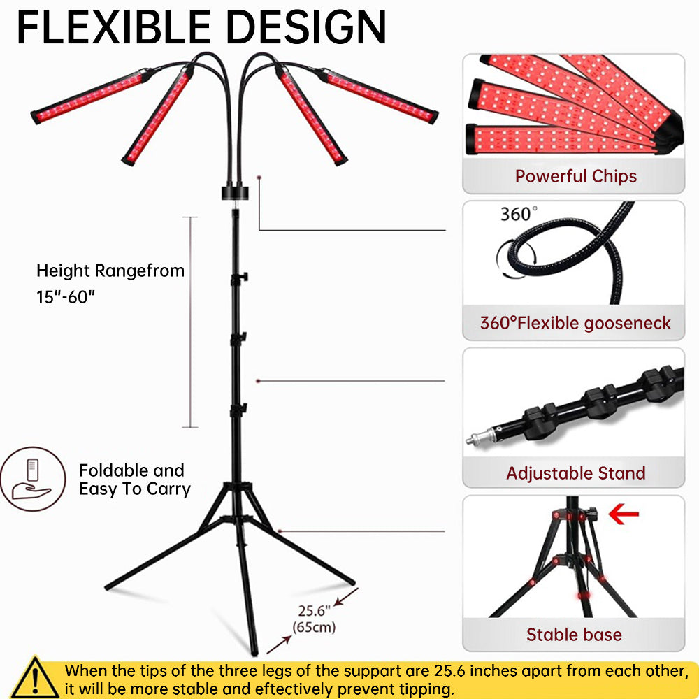 【Flexible and Adjustable】This four heads infrared light with foldable sturdy tripod stand and 360° gooseneck can adjust the height from 15 to 60 inches to meet your different needs. In addition, you can set a timer of 5 to 30 minutes, so that you don't worry about overexposure when you fall asleep.