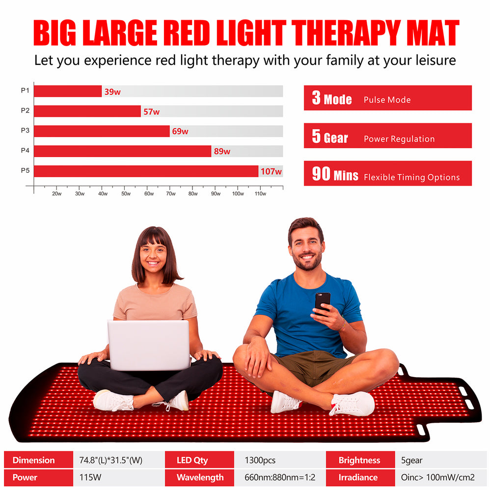 75" x 32"(190*80cm) large red light therapy mat comes with 1300 red LED beads, each containing 3 LED chips. The 660nm red light & 850nm near-infrared light therapy pad digs deep into tissues to help with inflammation & the natural repairing of your cells, supporting your recovery from skin damage.