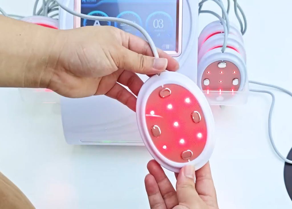 ćEMS LipolaserćCombine the technology of EMS and Lipo in the slimming laser plates. Microcurrent is used to enter the muscle cells through the skin while the low-level laser energy targets and breaks fat cells and breaks down stored triglycerides.