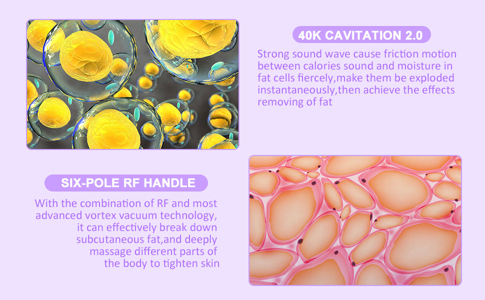 【6 in 1 + One Year Warranty】Equipped with 6 different massage heads, Includes 40KHz cavitation head, negative pressure head, tripolar head, quadrupole head and sextupolar head. a complete set of programs for all skin types and body parts to meet the needs of body care, skin tightening, fat reduction, metabolism boosting, etc. We offer an exclusive one year warranty on our equipment with an easy to replace process. If you have any questions, please feel free to contact our friendly customer support team.