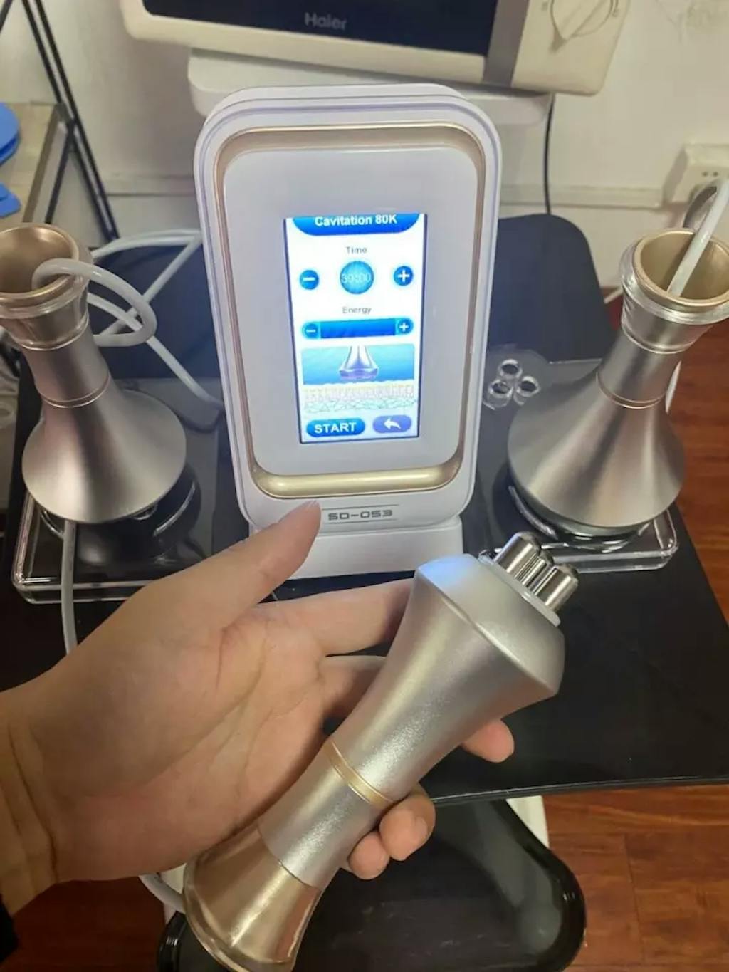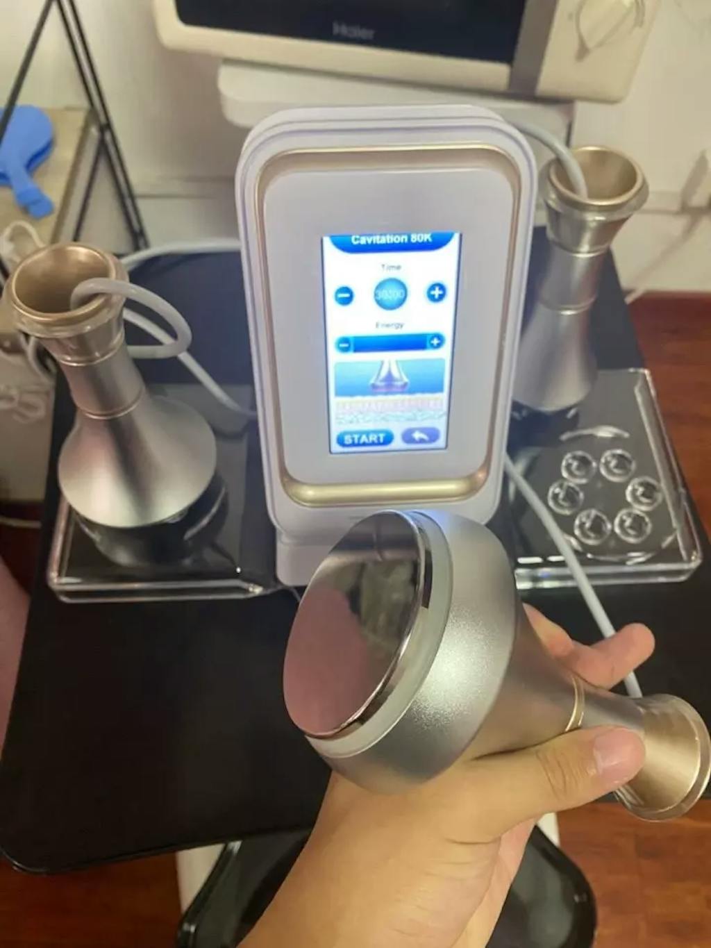 This cavitation machine has a really solid, high-quality feel to it. The probes are all metal, which gives it a premium touch. It's very easy to operate and straightforward to use, and clients say it's comfortable with noticeable results.