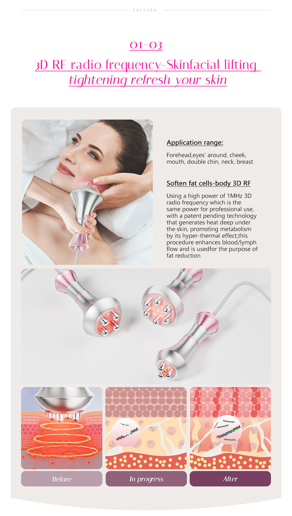 【Wrinkle Removal and Firming】 Multi-head massage of the skin releases skin cells and promotes rapid synthesis of collagen by fibroblasts, thus stimulating skin muscle tone, enhancing skin elasticity, eliminating facial wrinkles and tightening the skin.