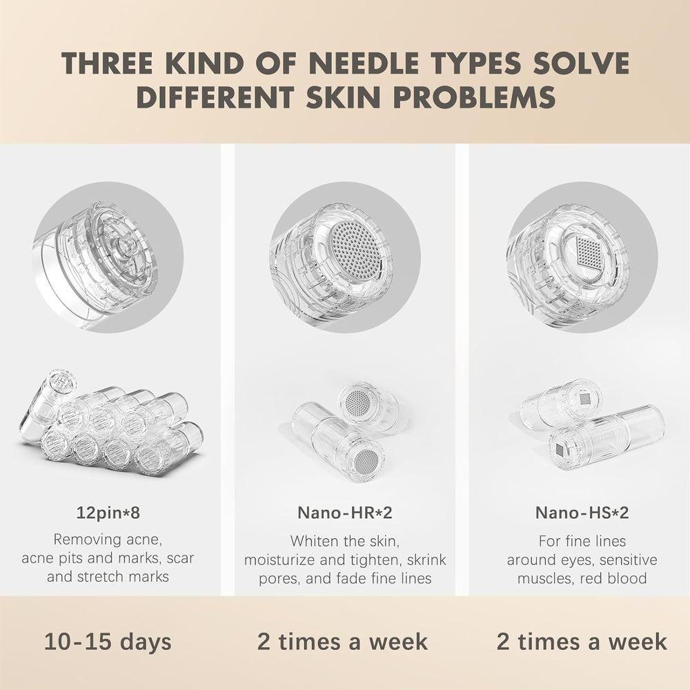 Versatile Needle Cartridges: Choose from three specialized needle cartridges, 12-pin, 24-pin, 36-pin, Round Nano, 3D Nano, to target your skin concerns, including acne removal, skin brightening, moisturising, tightening, and fine line reduction