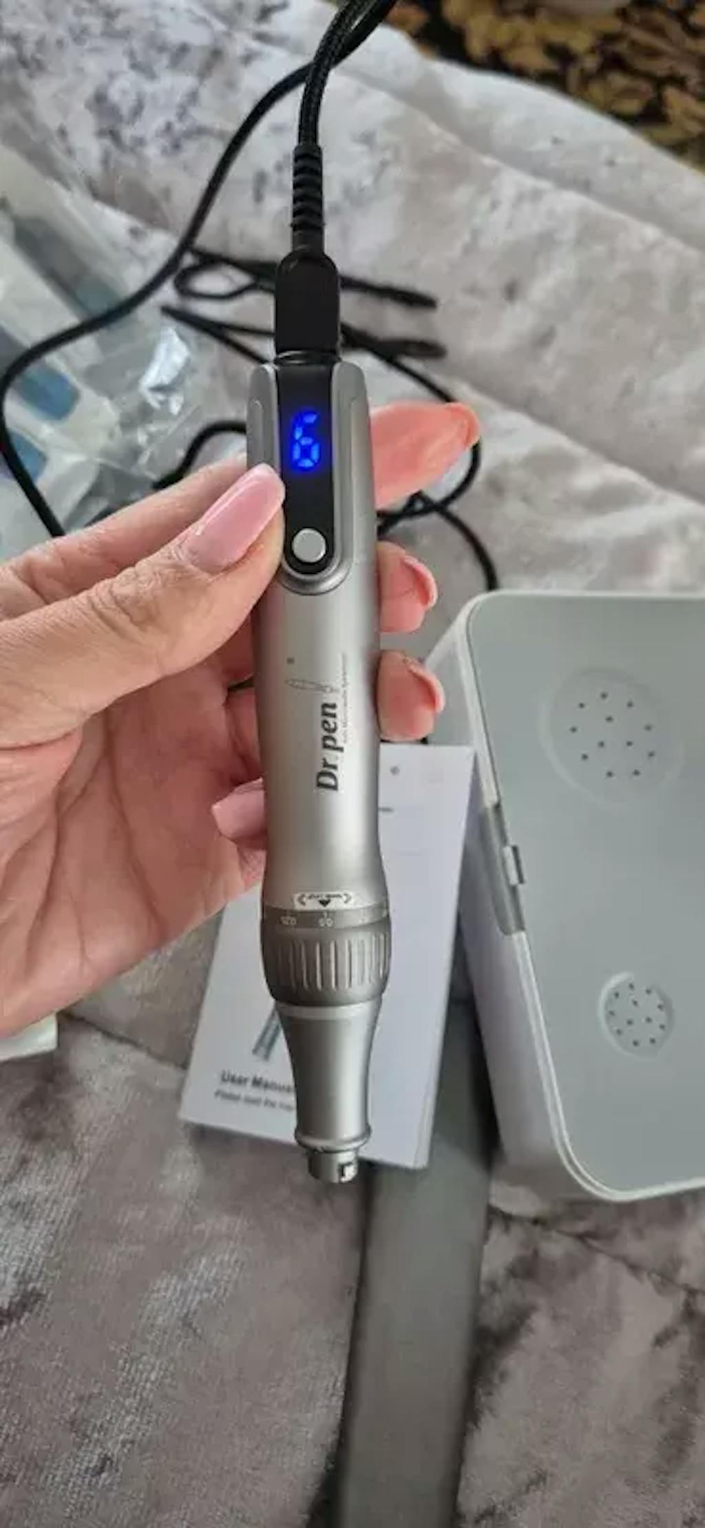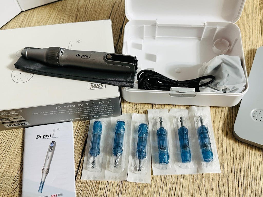 A microneedling pen is delivered, including 5 needle cartridges and a charging cable.