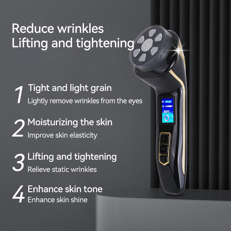 There are different programs: HIFU ultrasound for deep treatment, RF for tightening and warming, EMS microcurrent for muscle toning and gentle vibration, and pulsed light for skin care and soothing.