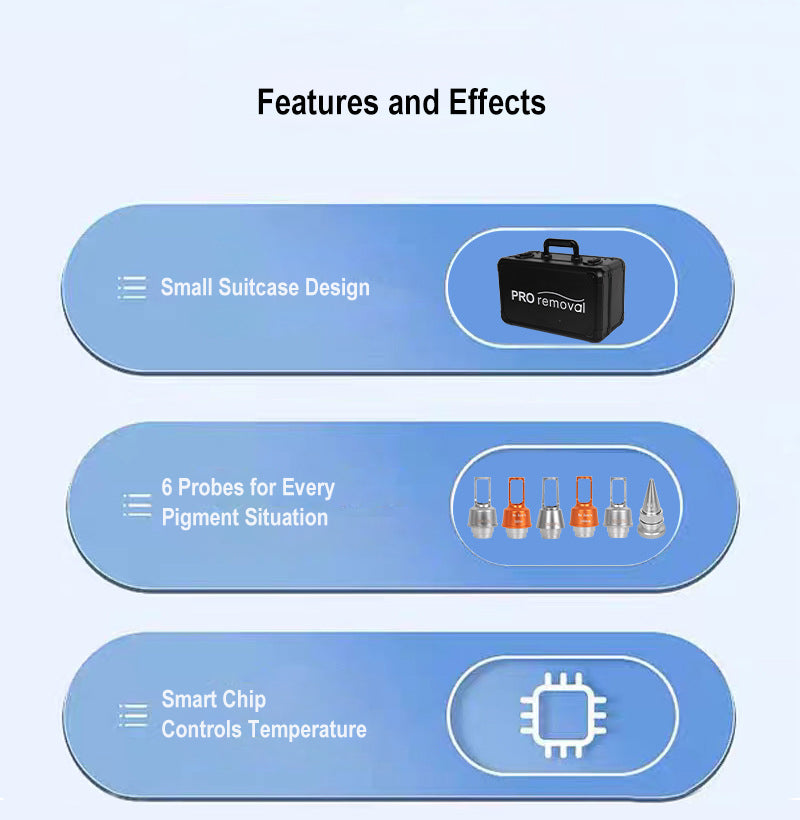 【Six professional Probes】Includes an exclusive eyeliner probe,the safest way to remove delicate eye-area tattoos, plus specialized heads for eyebrows, tattoos, age spots, and even the Black Face Doll attachment for skin brightening. One compact device handles all your pigment concerns.