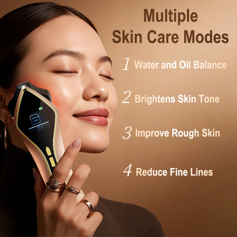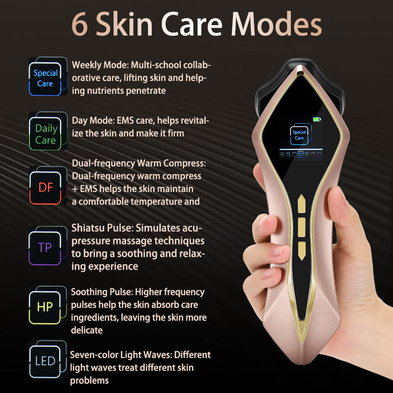 【6in1 Smart Skincare】One device integrates six professional modes: Special Care (SC), Daily Care (DC), Dual-Frequency Heating (DF), Tapping Pulse (TP), Soothing Pulse (HP), and 7-Color LED Light Therapy. It meets all your skincare needs, from deep cleansing and serum infusion to lifting and firming.