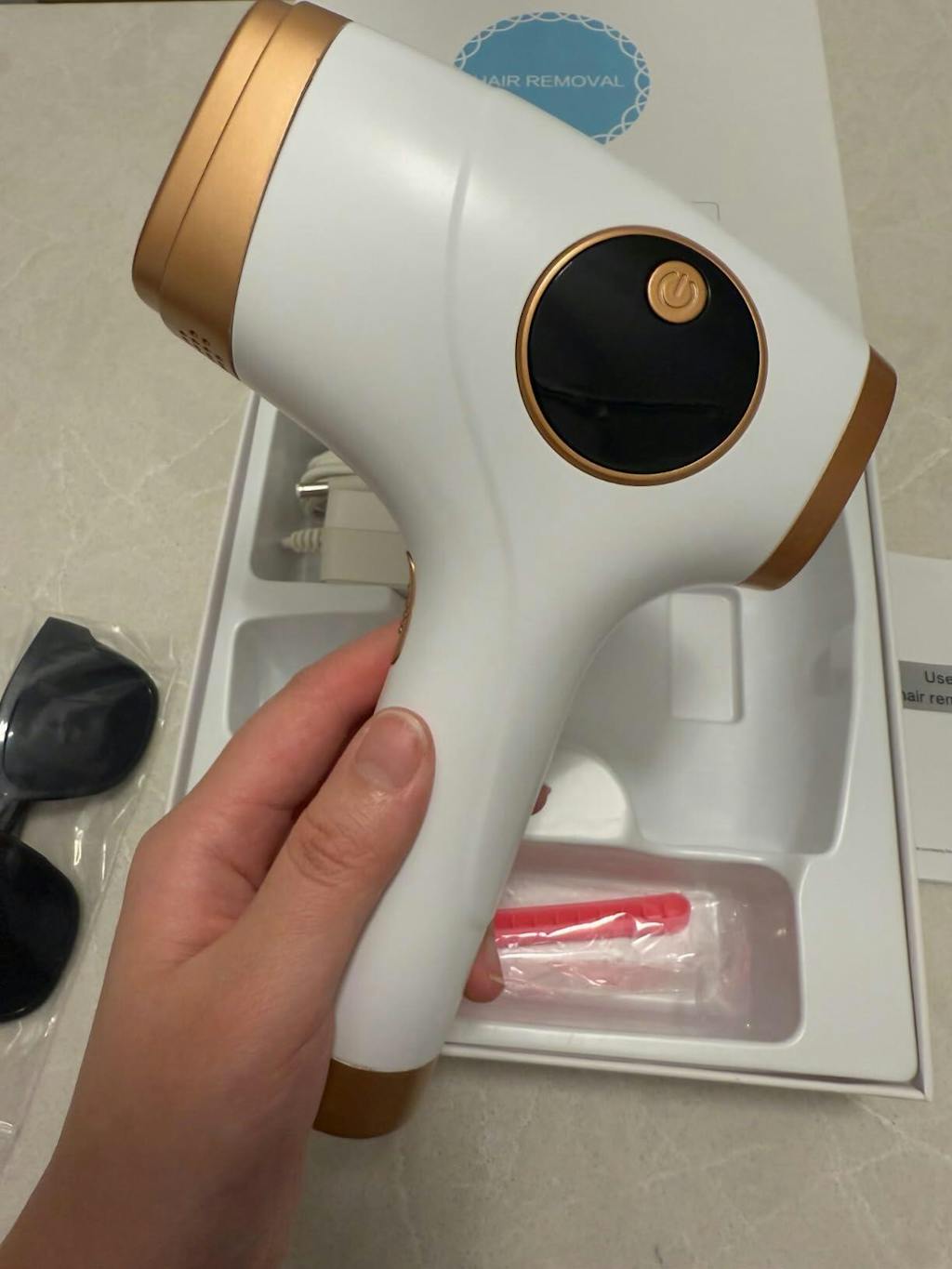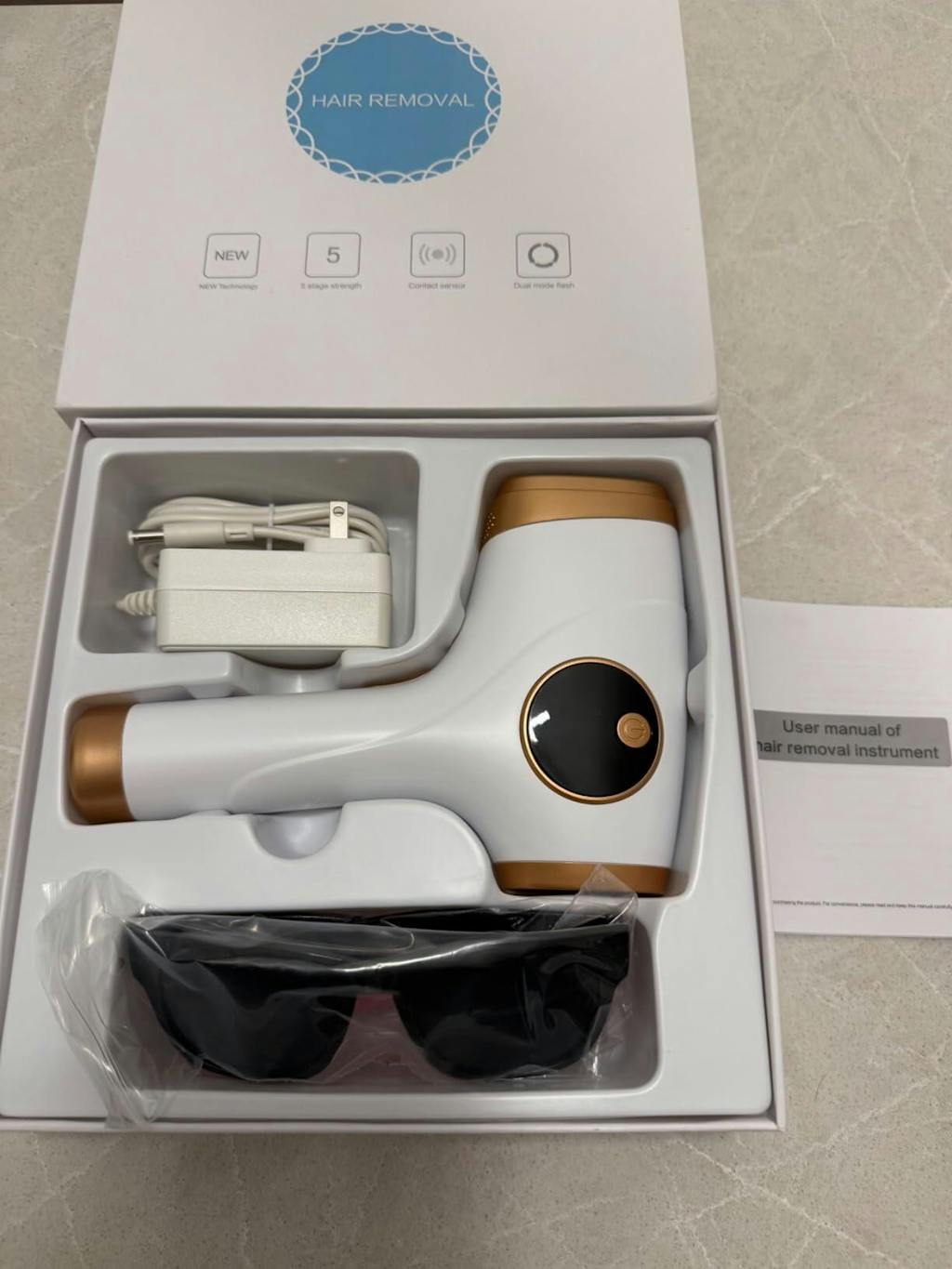 In addition to an IPL hair removal device, the package also includes safety glasses, a hair scraper and a charger. Provide professional hair removal experience.