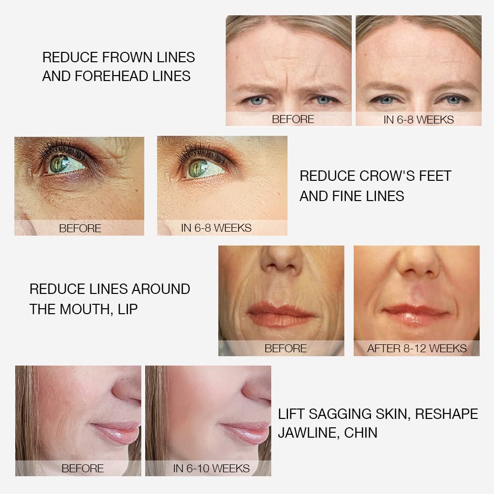 visible results in average 40 - 90 days! results from 50,000 customers aged between 20 and 70 from cooperative beauty salon show that 90% saw their skin looked overall healthier in the first week, over 73.3% saw visibly improved elasticity & firmness in 6-8 weeks. after 8-12 weeks of use, 78% saw a more lifted look, 85% saw visibly plumper, more volumized skin. 75% saw a more contoured jawline and body contouring. fine line and wrinkles start to fade in 8 - 12 weeks of use